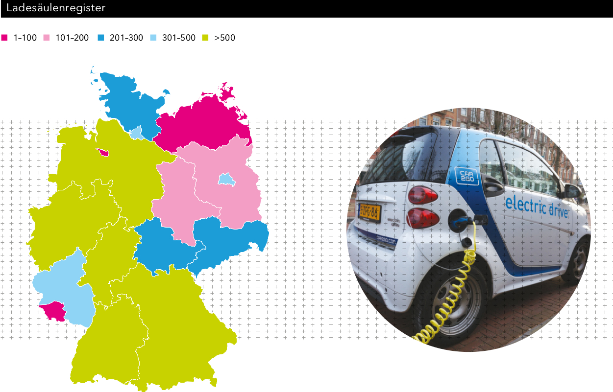 Auch die geografische Verteilung der Ladepunkte spielt eine Rolle: Laut dem Bundesverband finden sich teilöffentliche Ladepunkte bislang meist in Parkhäusern, Supermarktparkplätzen und Hotelgaragen. Ein Blick auf das Onlineportal Ladesaeulenregister.de zeigt zudem, dass derzeit vor allem die großen Ballungsräume im Rhein-Main-Gebiet, in Nordrhein-Westfalen sowie die Zentren der Automobilindustrie in Süddeutschland – vornehmlich Stuttgart, München, Ingolstadt – relativ dicht ausgebaute Ladekapazitäten aufweisen.